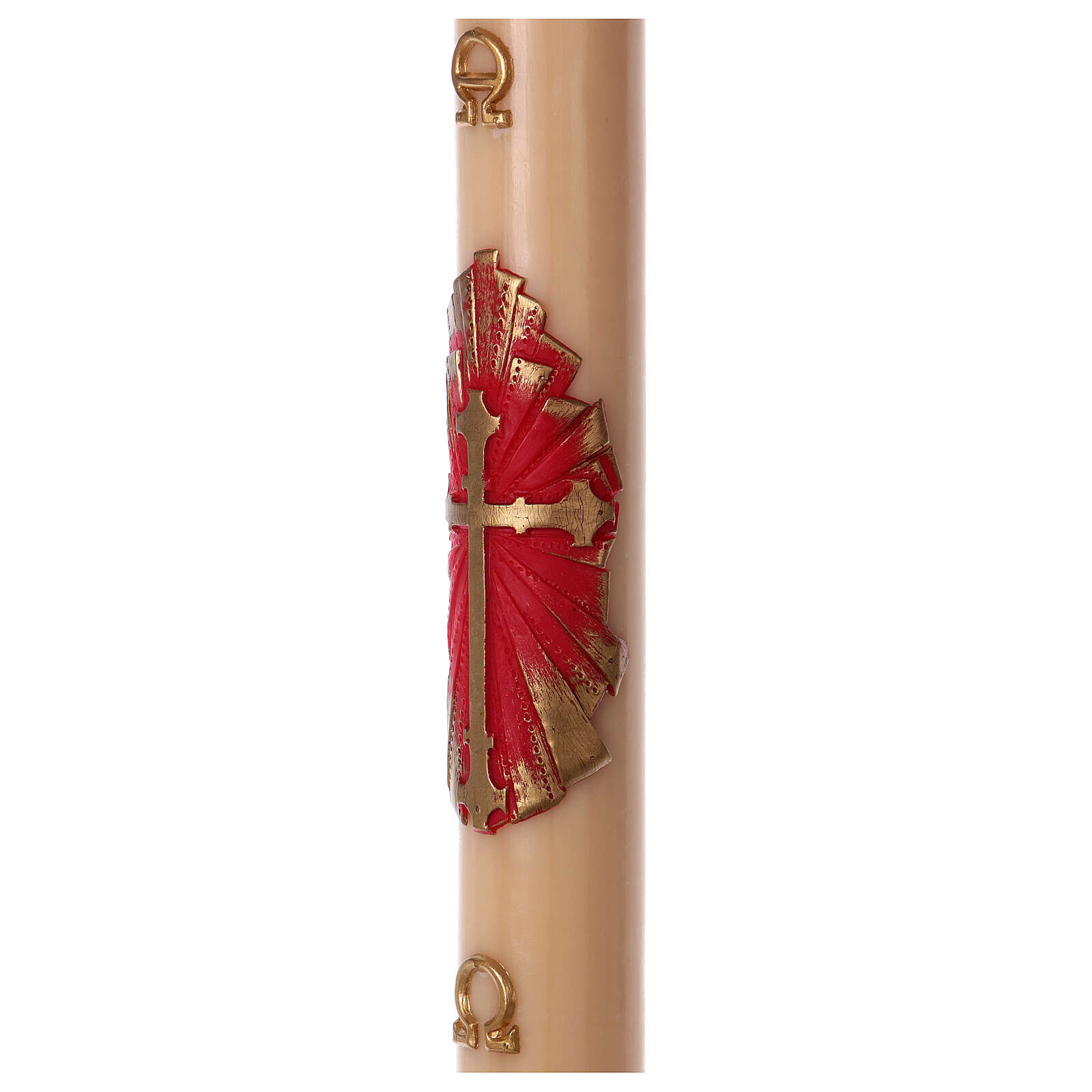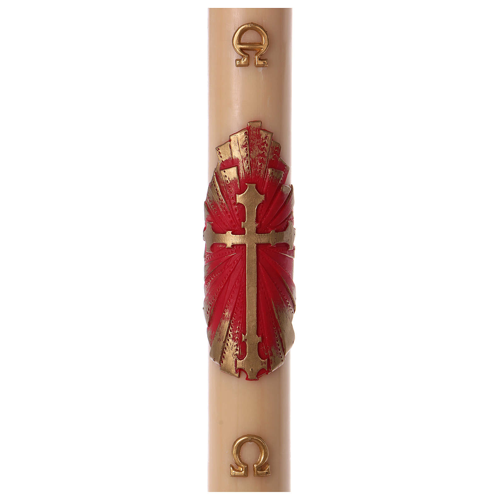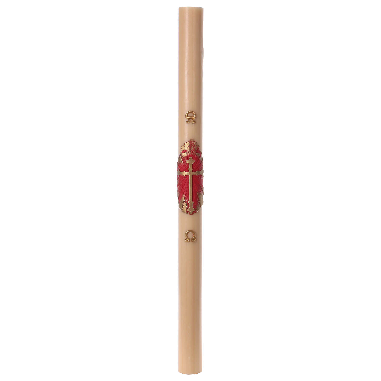 Círio pascal cera de abelha cruz antiga 8x120 cm. Círio pascal em cera de abelha produzido na Itália com decoração de cruz antiga dourada sobre fundo vermelho e ouro, acompanhada pelas letras Alfa e Ómega.Duração: 10 dias cerca.
