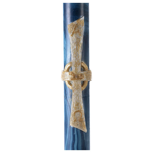 Círio Pascal marmoreado azul cruz com cordeiro, Alfa e Ómega, 120x8 cm