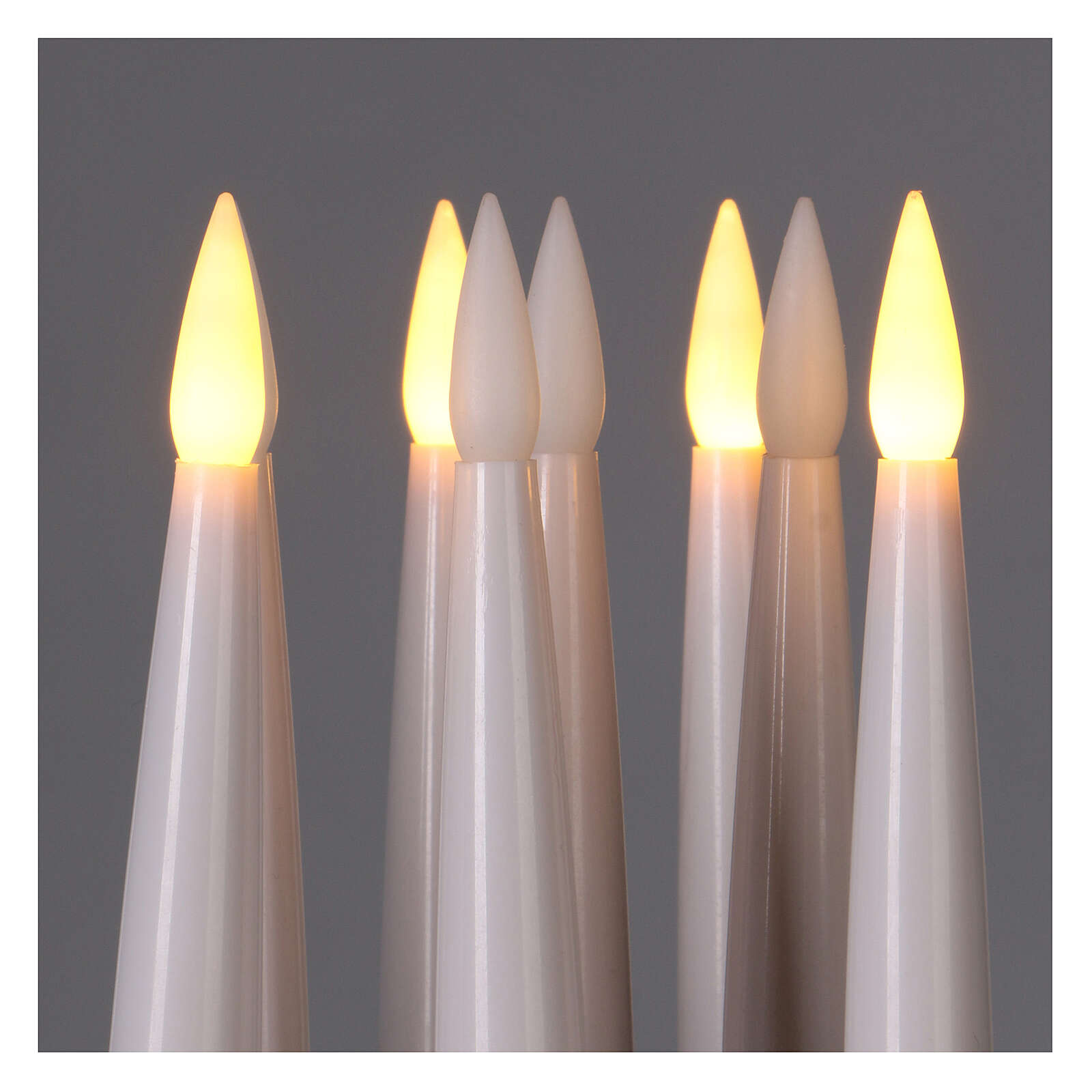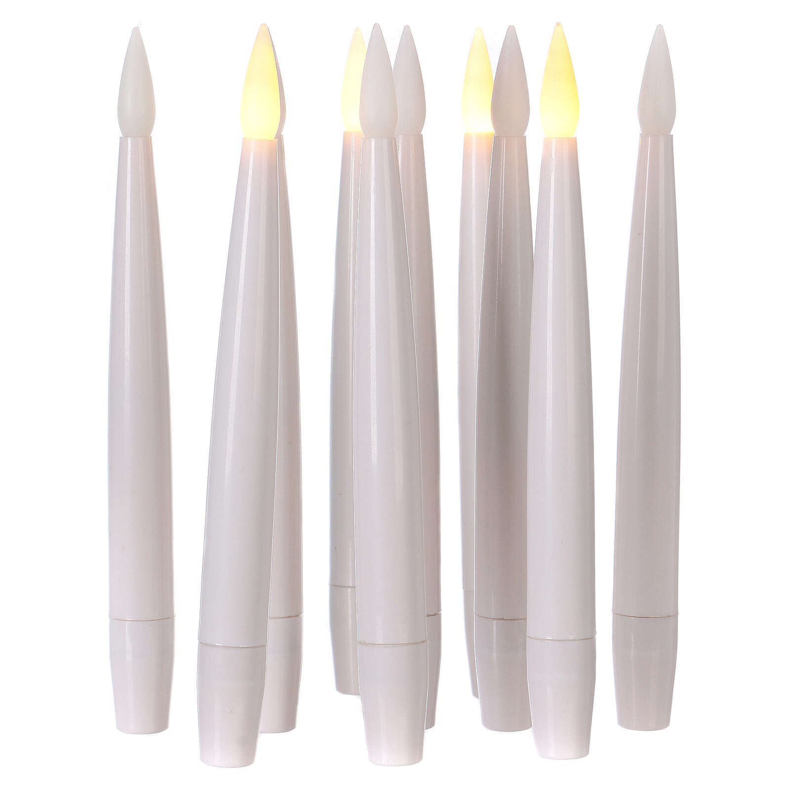 Conjunto velas com controle remoto 10 peças. Conjunto de 10 velinhas brancas em resina alimentadas cada uma por uma pilha AAA 1,5V (não incluídas).