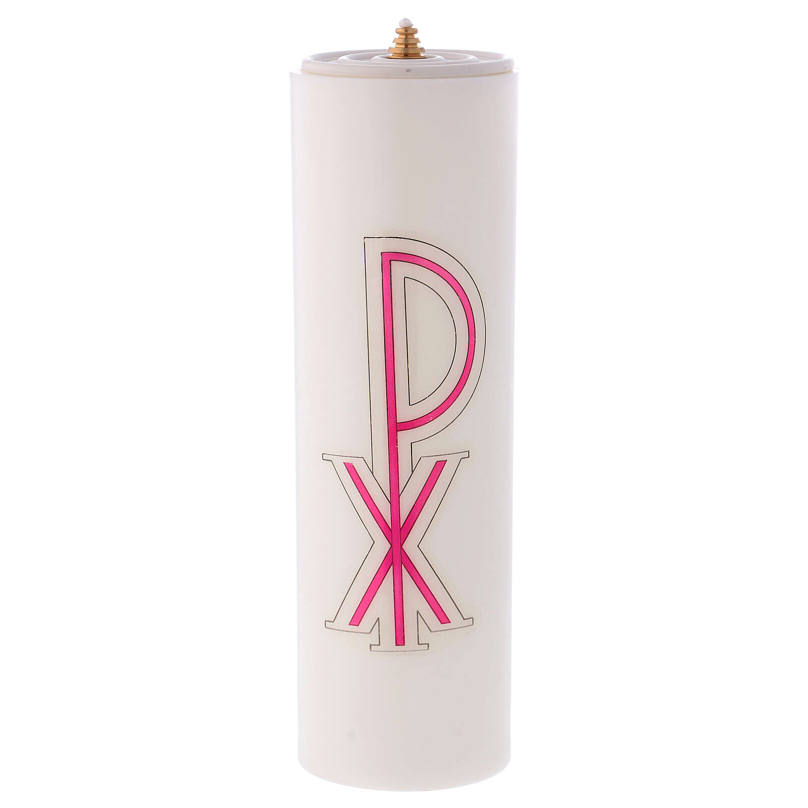 Vela cera líquida com cartucho Chi-Rho 25 cm. Vela de cera líquida para altar com cartucho de cor branco e impressão Chi-Rho.Altura: 25 cm. Diâmetro: 8 cm.