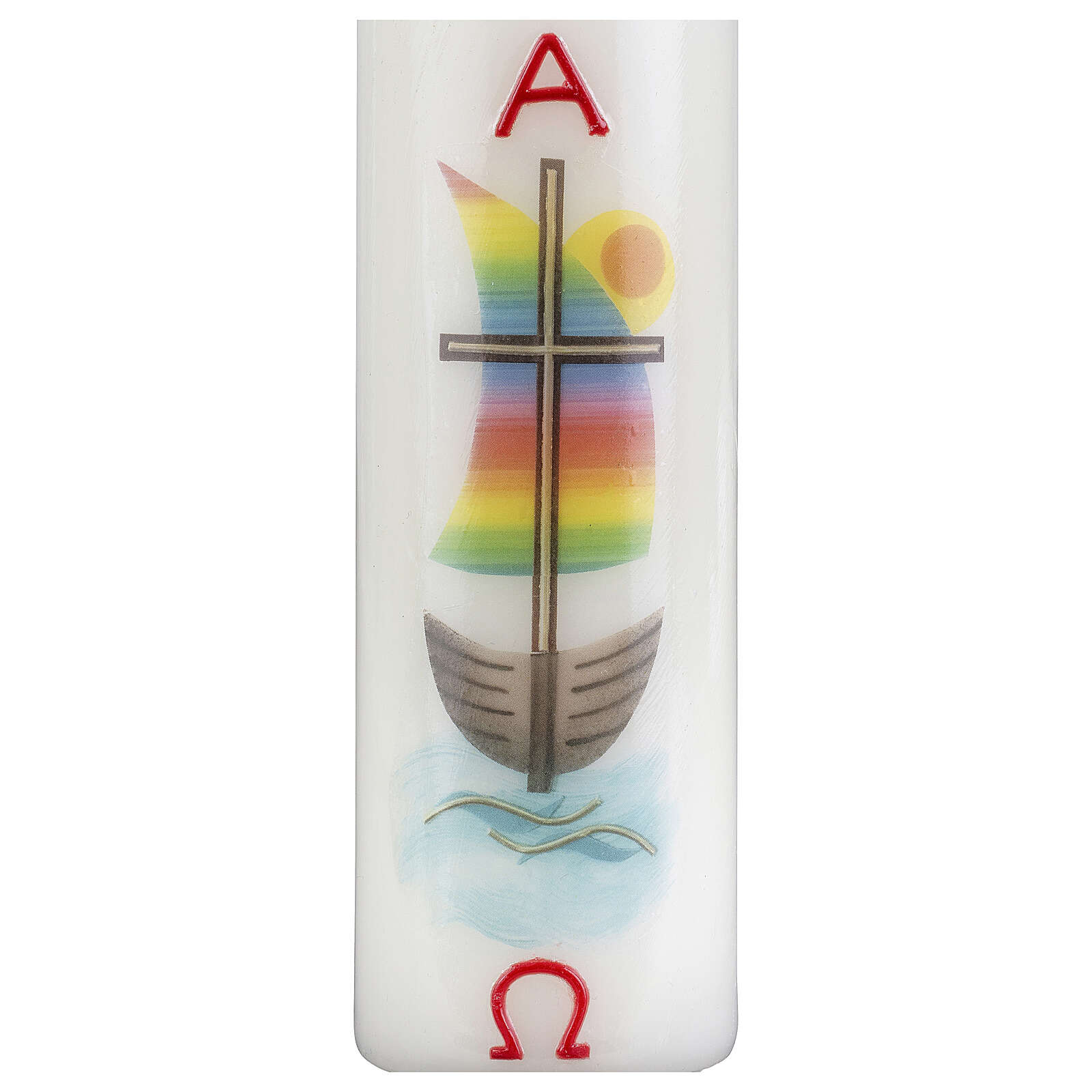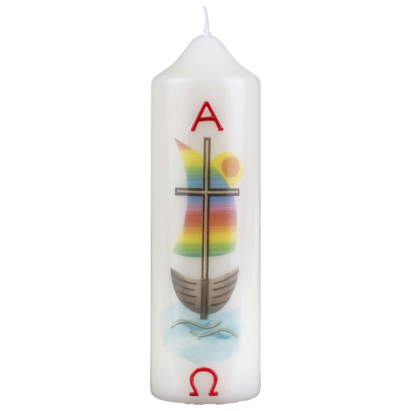 Vela com barco arco-íris e cruz 16,5x5 cm.