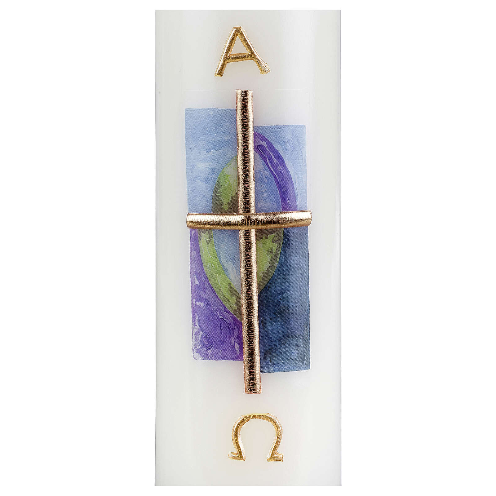 Linda vela de altar decorada com uma cruz dourada em relevo sobre fundo azul e verde e com letras Alfa e Ómega.
