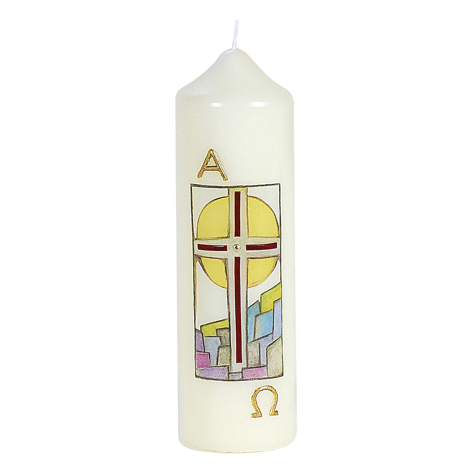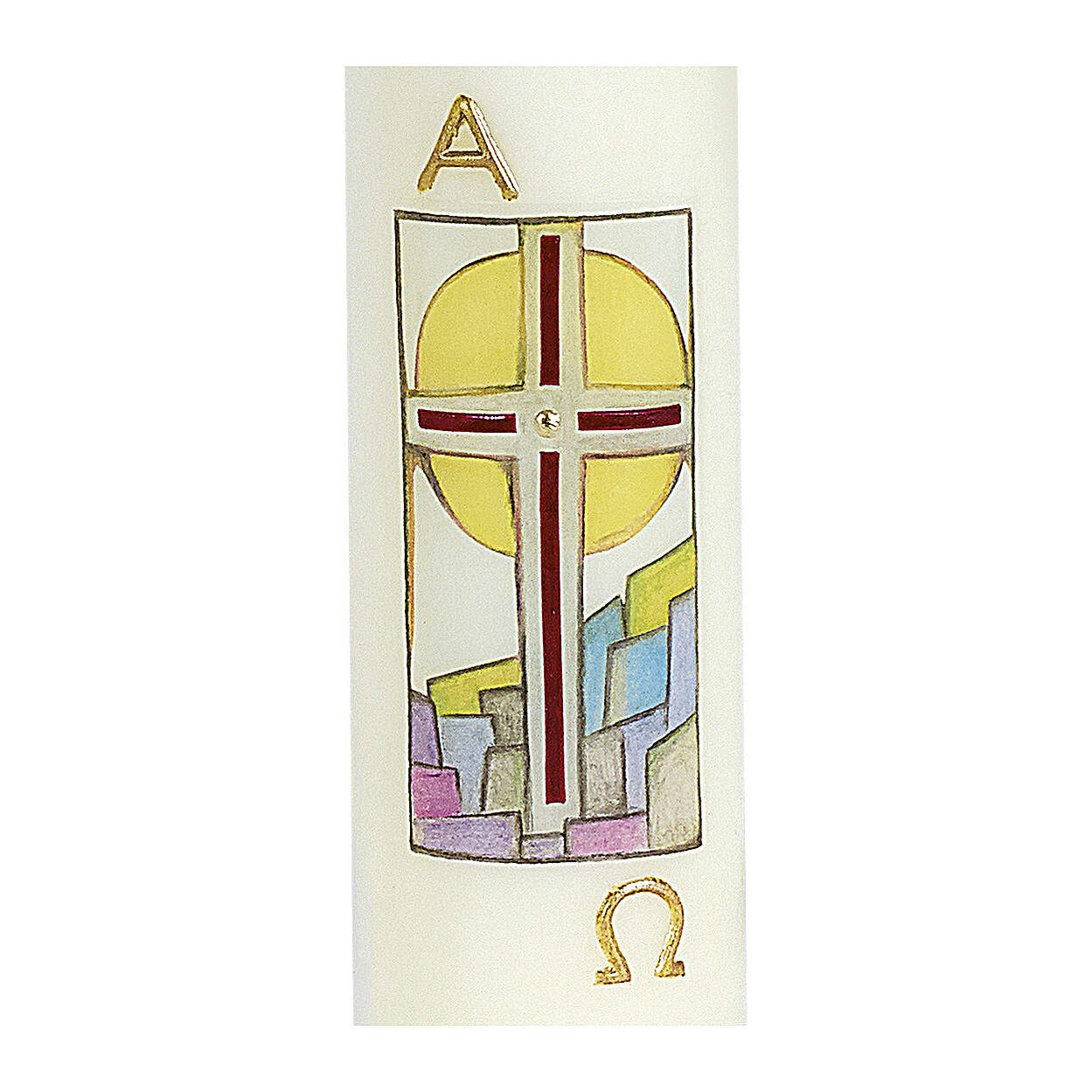 Linda vela de altar decorada com a imagem de uma cruz vermelha sobre uma paisagem estilizada. Sobre a imagem há a letra grega Alfa, debaixo da imagem há a letra grega Ómega.