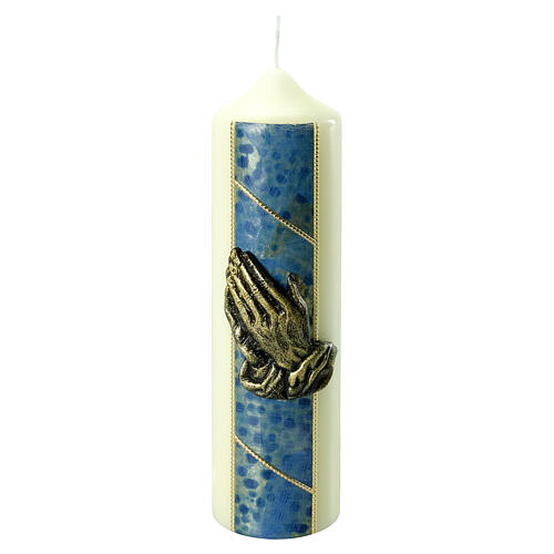 Linda vela de parafina branca amarelada decorada com uma faixa azul vertical e a imagem em relevo de mãos unidas em oração, efeito bronzeado.
