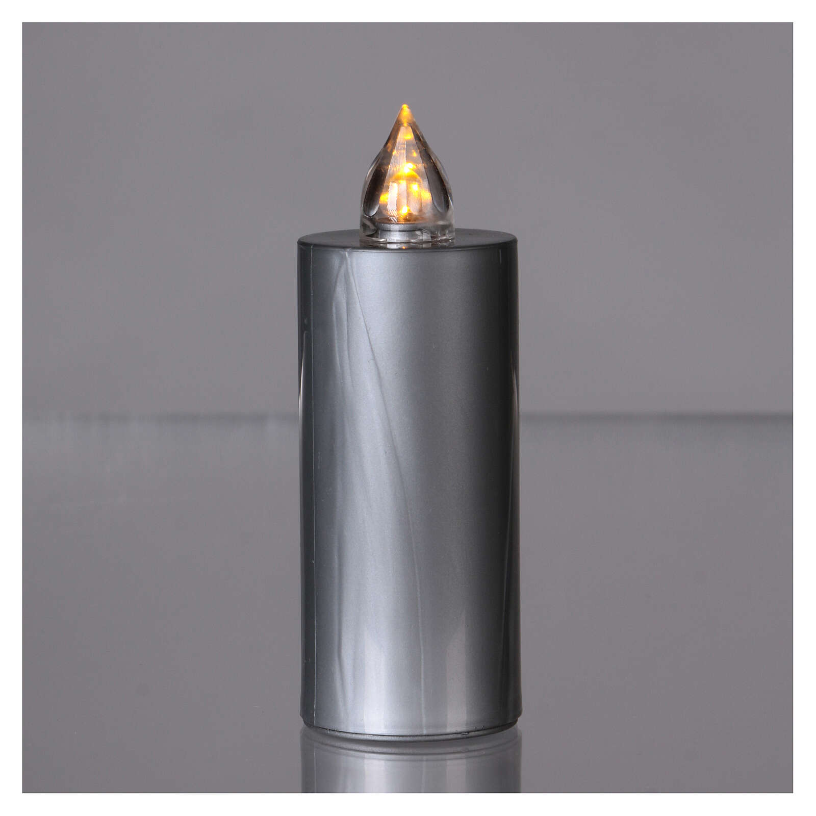 Vela Lumada prata luz amarela chama real. Vela eléctrica de pilhas (piljas AA substituíveis, não incluídas) com chama amarela efeito real. Duração: 100 dias. Produto Lumada.