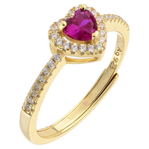 Anel regulável com zircão central, corte coração de 5 mm, cor rubi e acabamento dourado, fabricado em prata 925 com estrutura aberta.