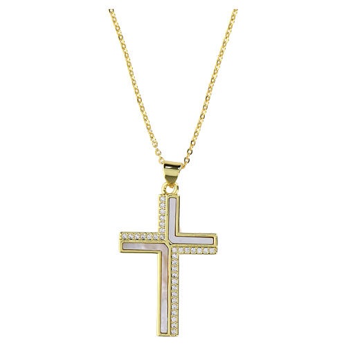 Colar com cruz pendente dourada com madrepérola e strass.