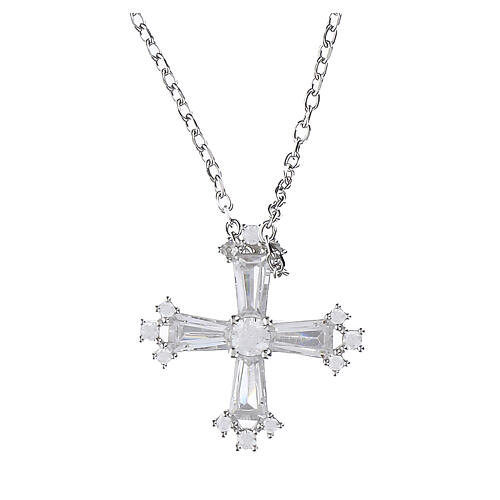 Colar em prata 925 rodinada com pendente em forma de cruz composto por zircões brancos de corte baguette e redondo, com elemento central de 3 mm. A cruz apresenta estrutura simétrica e composição geométrica; cada braço termina com três zircões redondos assentados em castão linear.