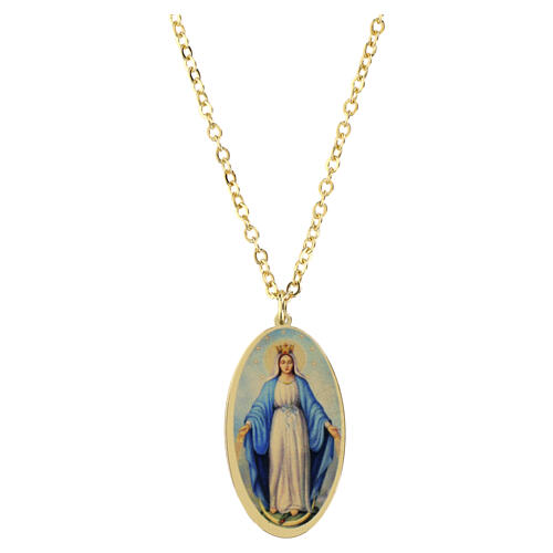 Colar em latão dourado Amen com medalha oval representando a Nossa Senhora de Medjugorje.