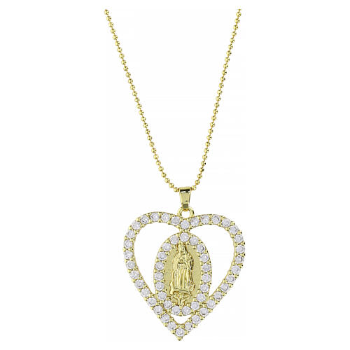 Medalha central com iconografia mariana inserida numa estrutura em forma de coração decorada com strass transparentes e ligada a corrente coordenada.