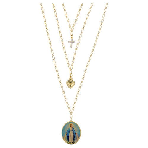 A corrente mais longa apresenta uma medalha de Nossa Senhora de Medjugorje, aproximadamente 3x3,5 cm, ricamente trabalhada; a corrente do meio traz um pingente em forma de Sagrado Coração; a mais curta exibe uma delicada cruz dourada adornada com zircões brancos para um toque de luz.