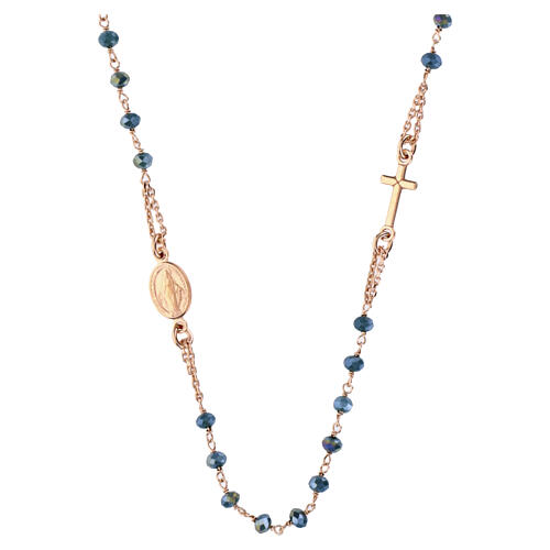 Lindo colar de prata 925 rosada decorado com contas de cristal azul-claro, cruz e medalha com imagens de Nossa Senhora das Graças num lado e do Papa Francisco no outro.