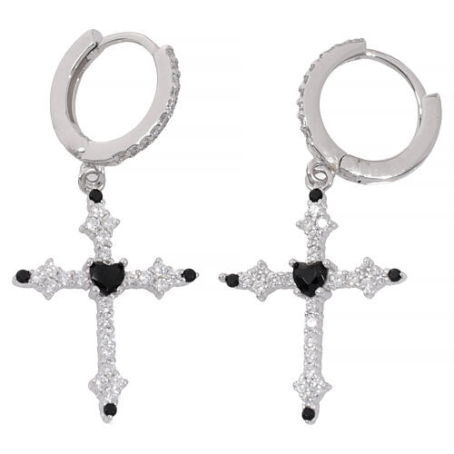 Brincos cruz com zircões brancos e coração preto Benedictus prata 925 rodinada.