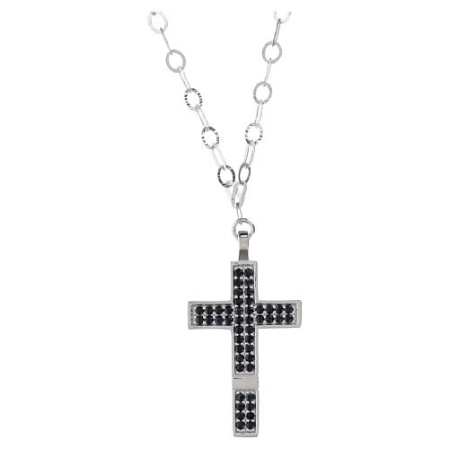 Colar cruz com pavé de zircões pretos, corrente plana em prata 925 com banho de ródio Benedictus