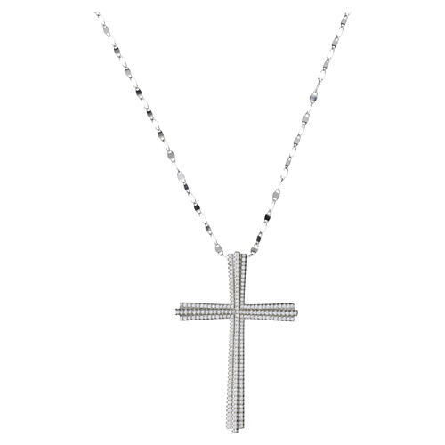 Colar moderno com maxi cruz pingente em prata 925, protegida por precioso banho de ródio. A cruz em relevo de 5,5x3,8 cm está coberta por pavé de zircões brancos e pende de uma corrente com elos chatos e brilhantes.
