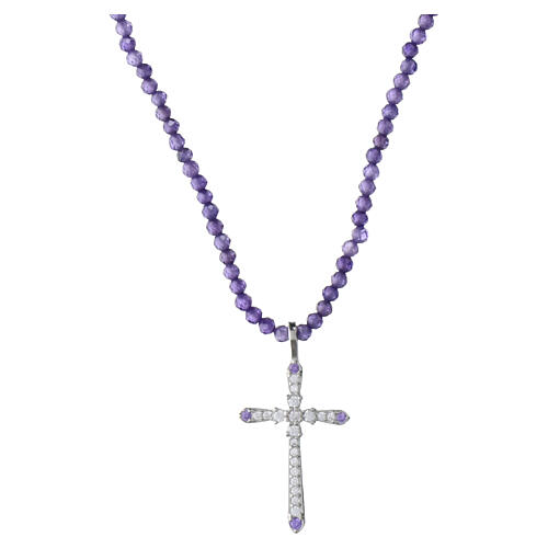 Este colar apresenta uma corrente com contas de vidro roxas facetadas que brilham à luz e uma cruz pingente central em prata 925 rodinada com zircões engastados em tons brancos e roxos.