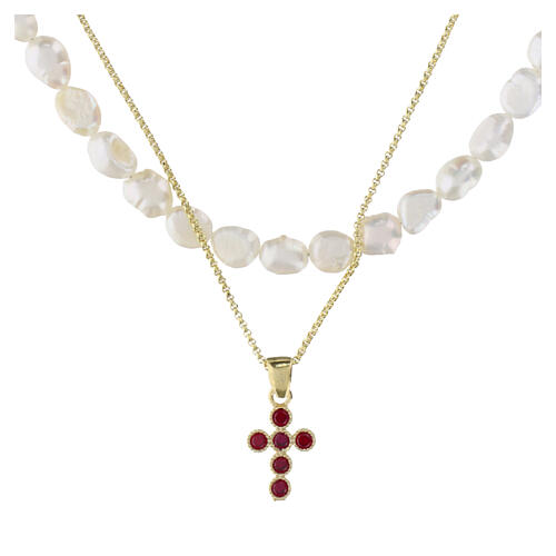 Colar duplo com um fio de pérolas naturais de forma irregular e outro de corrente dourada com cruz pingente adornada por zircões rubi. A peça é fabricada em prata 925 com acabamento dourado.