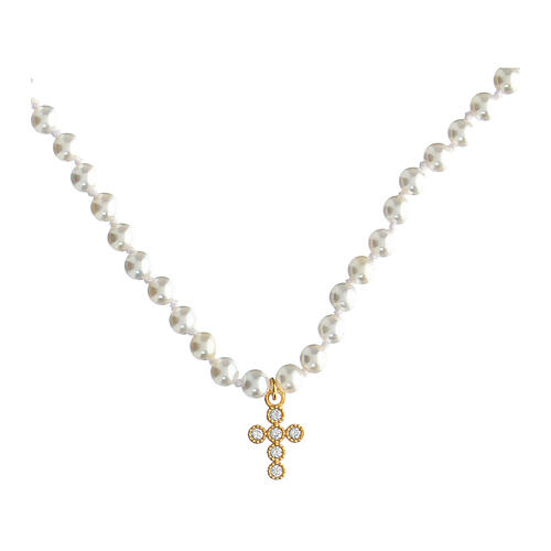 Colar Icona pérolas e zircões brancos Agios. Colar de pérolas de concha enriquecido por um pingente de prata 925 dourada em forma de cruz, decorado por zircões brancos.