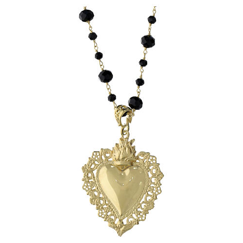 Este colar apresenta um grande pingente do Sagrado Coração decorado (4x3,5 cm) e uma corrente com cristais pretos de 6 e 3 mm de diâmetro.