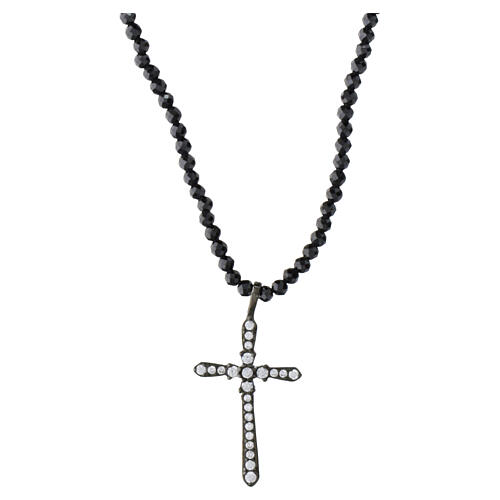 Colar em prata 925 com acabamento em ruténio, composto por uma corrente com contas de vidro pretas brilhantes e uma cruz pingente central em prata 925 engastada de zircões brancos. As contas têm corte facetado que lhes confere maior brilho à luz.