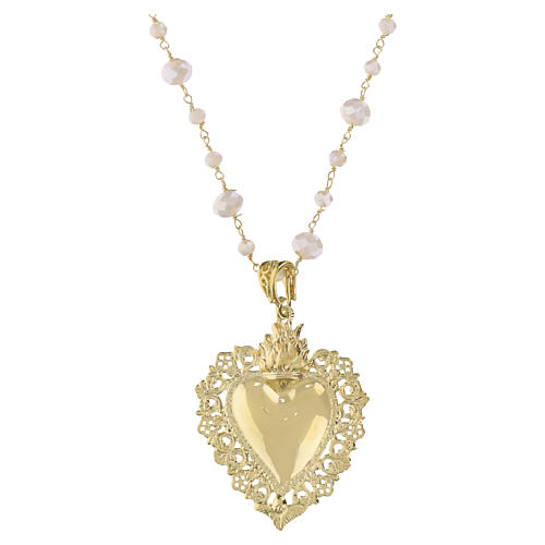 Colar com grande pingente do Sagrado Coração de Jesus (4x3,5 cm), confeccionado em prata 925 com banho de ouro. A corrente é enriquecida por cristais brancos facetados de 6 e 3 mm de diâmetro.