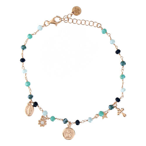 Pulseira Amore Agios prata 925 rosê contas azuis e berloques. Pulseira ideal como presente para uma rapariga, realizada na Itália por artesões experientes em prata 925 rosê com contas de pedras coloridas nos tons azul e verde e berloques vários.