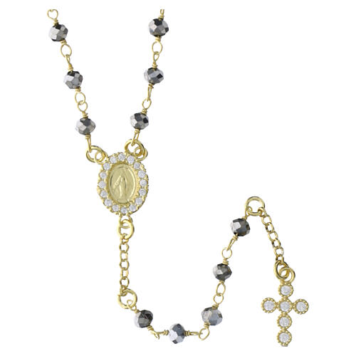 Terço-jóia usável com contas em hematita cinza-prateada facetada, de diâmetro 4 mm. A cruz central tem a forma da Medalha Milagrosa com moldura cravejada de zircões brancos. A cruz pendente mede 13x8 mm e é enriquecida com zircões brancos engastados.