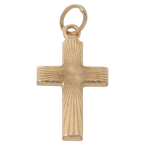Pingente cruz raios acetinados ouro 18K 0,7 gr. Pingente em forma de cruz em chapa convexa de bordos quadrados com desenho de raios de luz acetinados no centro dos braços. Jóia realizada na Itália em ouro amarelo 18K e entregada com certificado de garantia.
