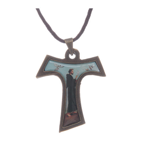 Tau São Francisco. Tau em metal cor de bronze com imagem de São Francisco de Assis e colar em fio.