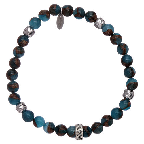 Pulseira AMEN ágata azul e nervura bronzite prata 925. Pulseira elástica AMEN com contas em ágata azul e nervura bronzite de 5 mm, contas prateadas e argola AMEN em acabamento radiado.