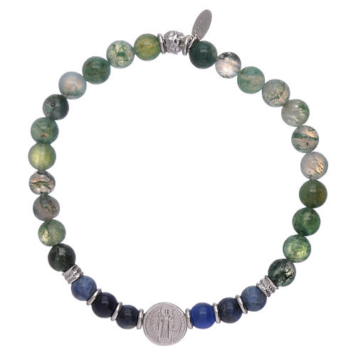 Pulseira AMEN para homem contas ónix e São Bento prata 925. Pulseira AMEN para homem com elástico transparente e contas em ónix multicolor e medalha de São Bento.