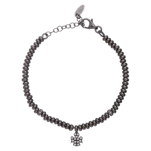 Pulseira prata 925 radiada preta AMEN e anjo. Pulseira em prata 925 radiada preta com contas em forma de elos de 2-3 mm, um anjo e dois entremeios decorados com zircões brancos.