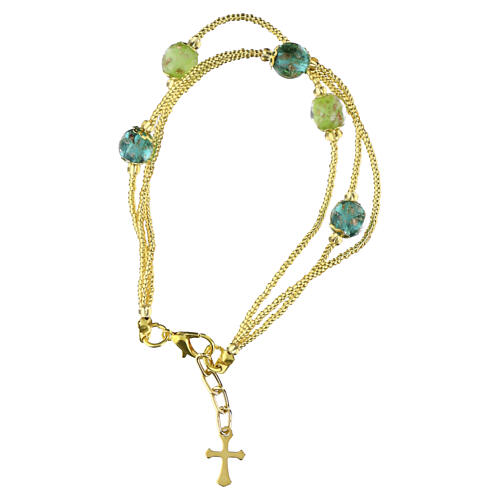 Pulseira 3 voltas com pérolas de 5 mm em vidro de Murano verde claro e verde-esmeralda, acabamento dourado.