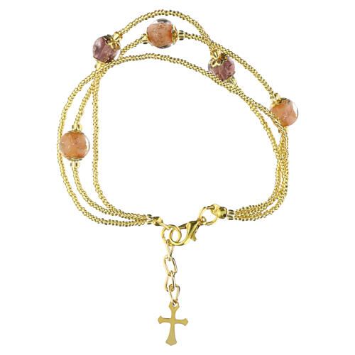 Pulseira 3 voltas pérolas vidro de Murano 5 mm acabamento dourado bege violeta.