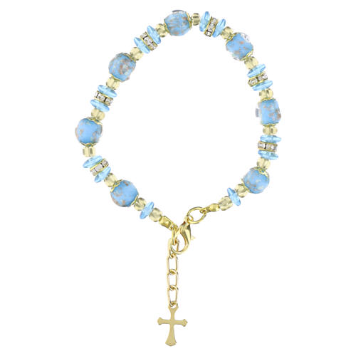 As contas em vidro azul celeste opaco e os elementos translúcidos do mesmo tom alternam-se em sequência regular, complementados por componentes em metal dourado, incluindo uma pequena cruz dourada como detalhe decorativo.