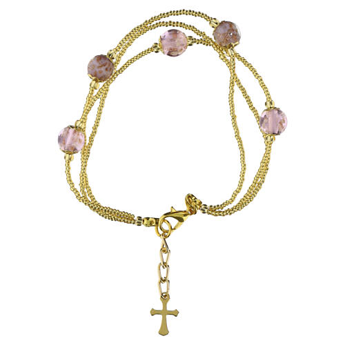 Pulseira dourada 3 voltas com contas 5 mm em vidro de Murano lilás e cor-de-rosa.