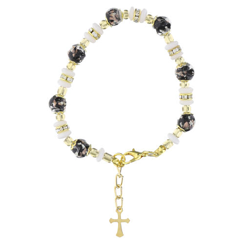 Pulseira em vidro de Murano 8 mm preta e contas brancas, acabamento dourado.