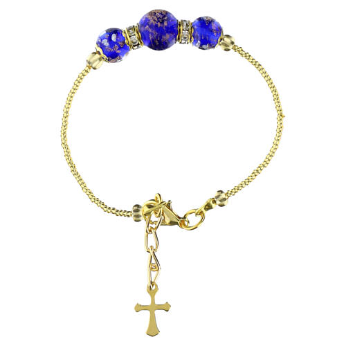 Pulseira-jóia em vidro de Murano azul 10 mm com detalhes e cruz dourada.