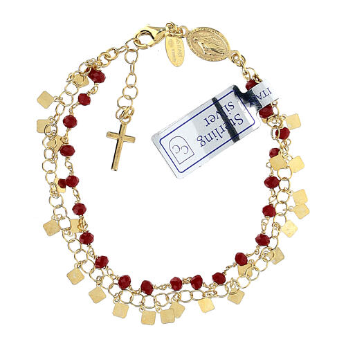 A pulseira é composta dois fios de corrente, um com contas facetadas de 2 mm em cristal vermelho vivo e outro com berloques quadradas planas de 2 mm em prata 925 e, nas duas extremidades da pulseira, uma Medalha Milagrosa e uma cruz, ambos de prata 925.