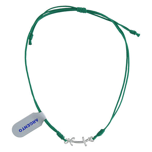Pulseira Jubileu corda verde cruz âncora prata 925. Pulseira ajustável feita de corda verde, decorada por uma cruz em prata 925 com extremidade em forma de âncora de 1,5x0,5 cm, símbolo do Jubileu.