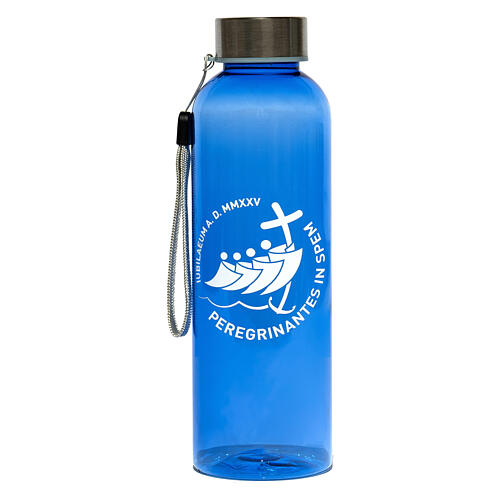 Garrafa plástico reciclado azul Jubileu 2025 kit do peregrino. Garrafa do peregrino azul em plástico reciclado rPET, uma alternativa ecológica para beneficiar das vantagens do plástico como material de embalagem mas com um menor impacto no ambiente.