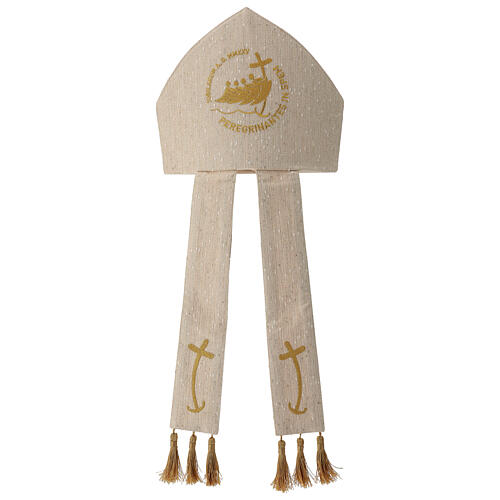 Mitra branca e dourada bordada cruz âncora Jubileu 2025.
