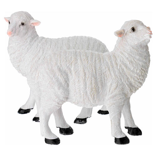 Conjunto de 2 ovelhas em resina para presépios com estátuas de 24 cm. Uma ovelha com a cabeça virada para a direita e a outra para a esquerda, criando uma cena dinâmica e natural. Dimensões de cada ovelha: 15x16x5 cm.