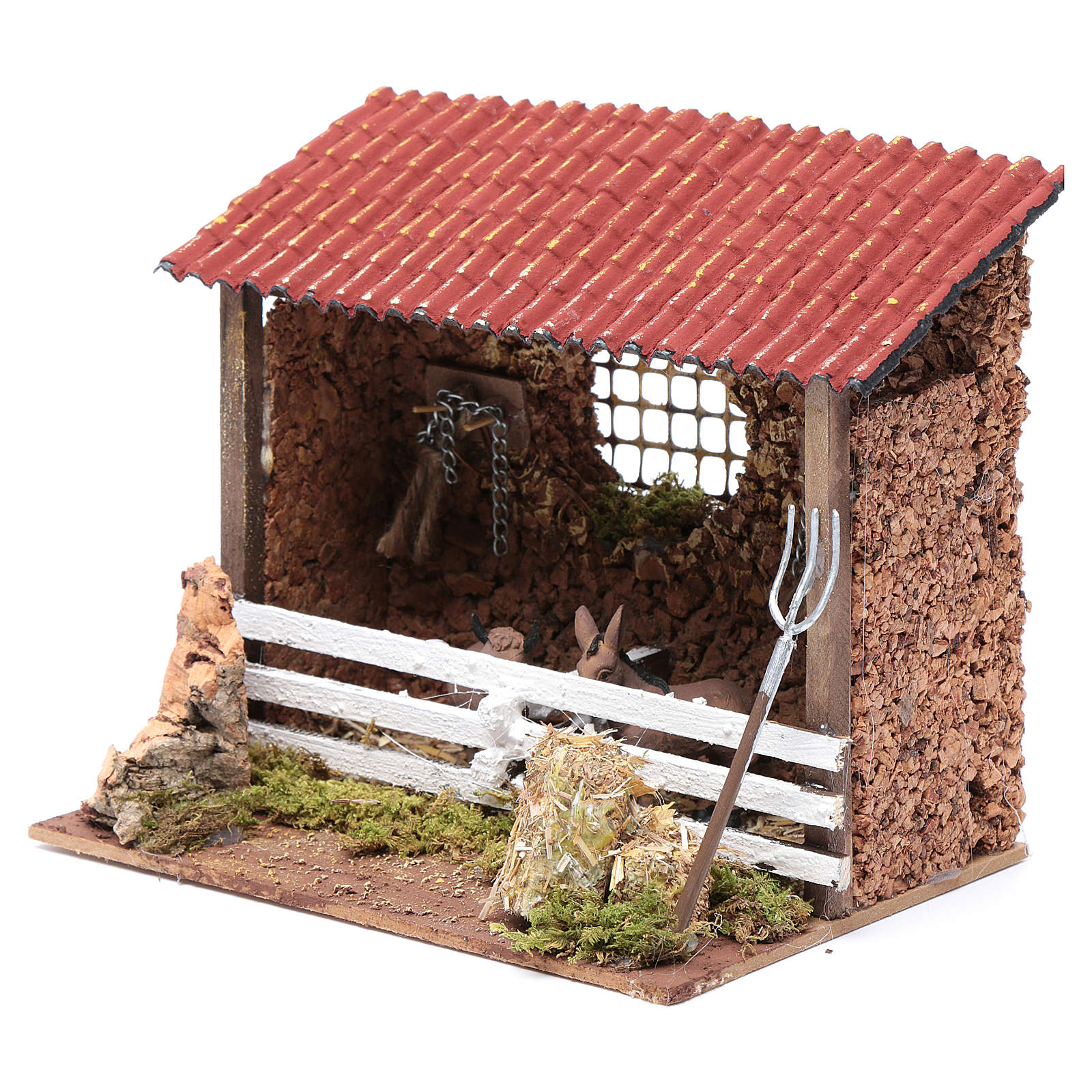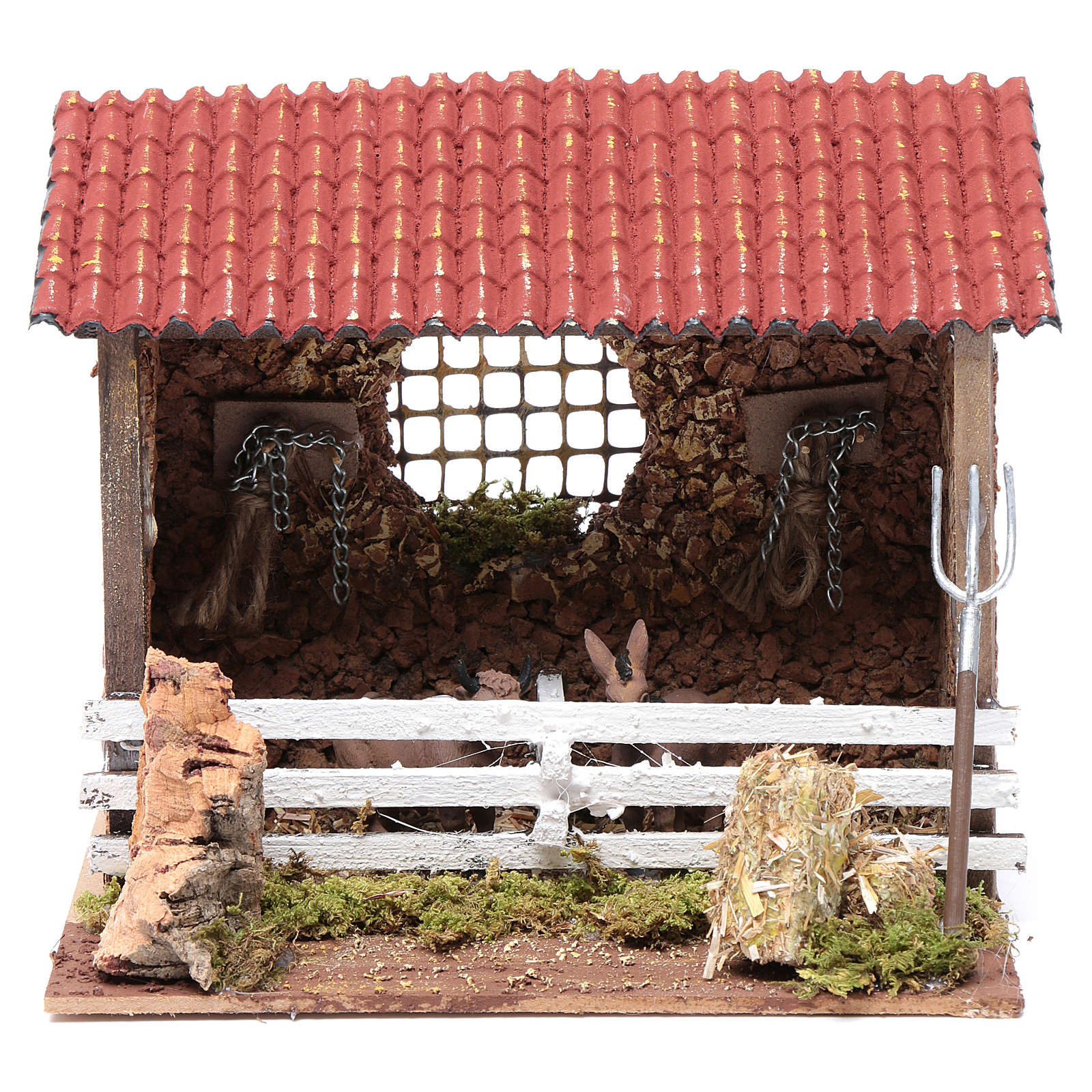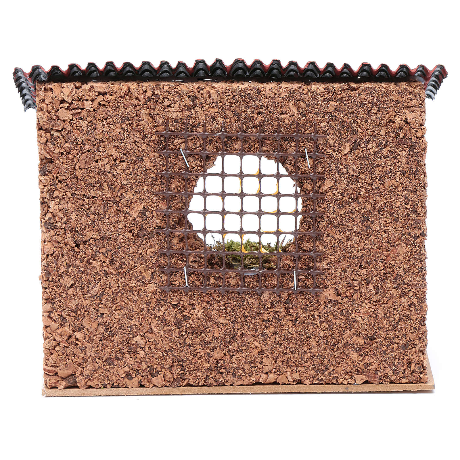 Curral com telhado boi e burrinho 17x20x13,4 cm presépio. Curral com parede de cortiça, janela redonda e objetos em miniatura, completado por telhado de telhas vermelhas e peças de boi e burrinho.