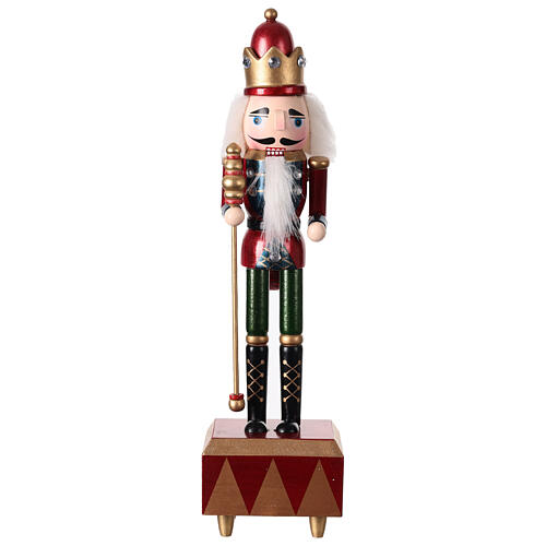 Caixa de música quebra-nozes madeira 30x10x10 cm. Caixa de música em madeira com estatueta de quebra-nozes sobre uma base quadrada decorada em vermelho e ouro. Na base há uma chave para ativar a caixa, reproduzindo a melodia We Wish You a Merry Christmas.