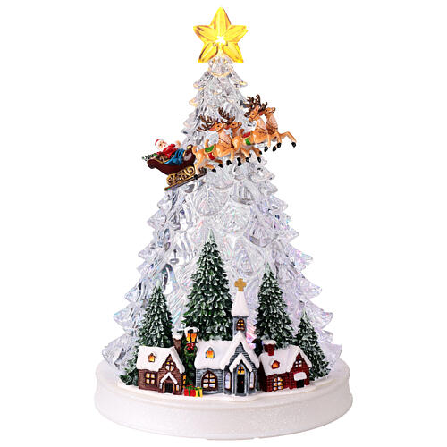 Árvore de Natal iluminada trenó Pai Natal 25x20x30 cm. Árvore de Natal com estrela e Pai Natal voando no seu trenó.