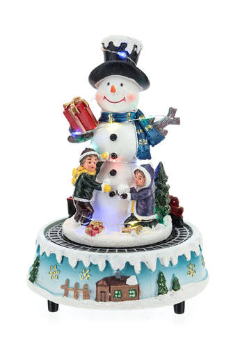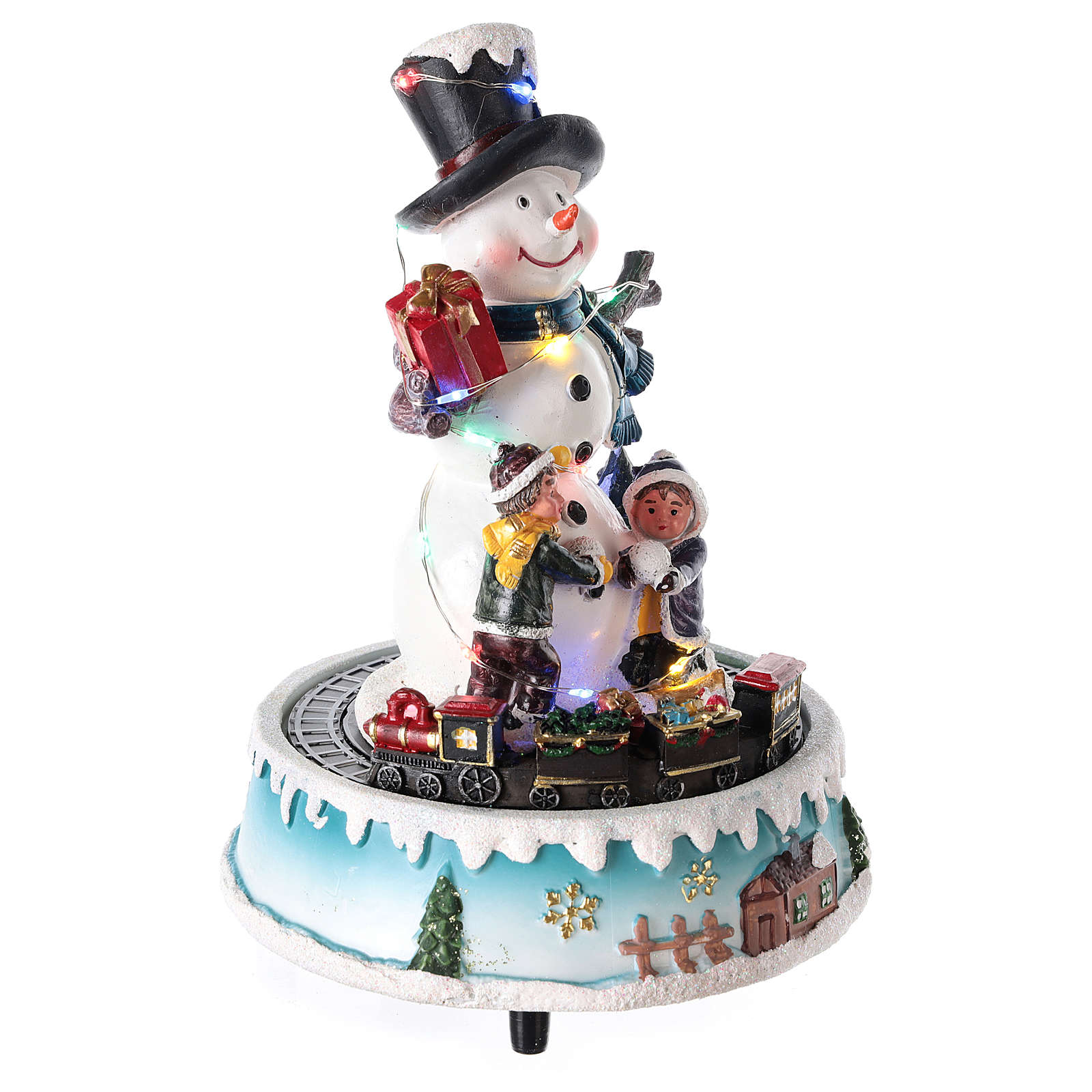 Boneco de neve com presentes 15x20 cm. Cena para cenário natalino em resina, alimentada por pilhas AA.Este modelo, compatível com outros cenários e acessórios do mesmo estilo (MyVillage e Lemax, por exemplo), pode ser animado por luzes, movimentos e música ao mesmo tempo ou só com movimentos e luzes.