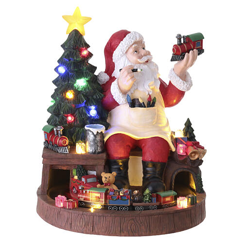 Estrutura decorativa com o Pai Natal sentado sobre uma base circular, árvore de Natal iluminada, bancada de trabalho com brinquedos e um comboio em trilho na base.