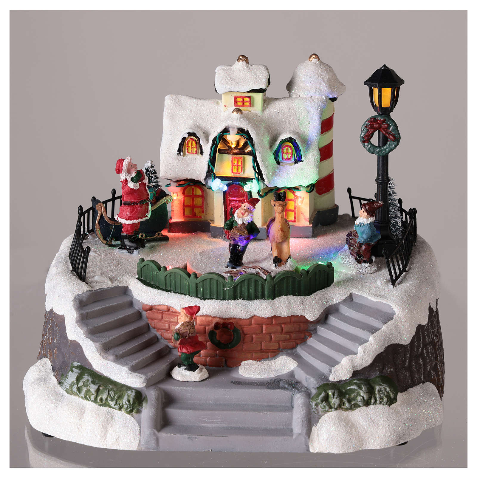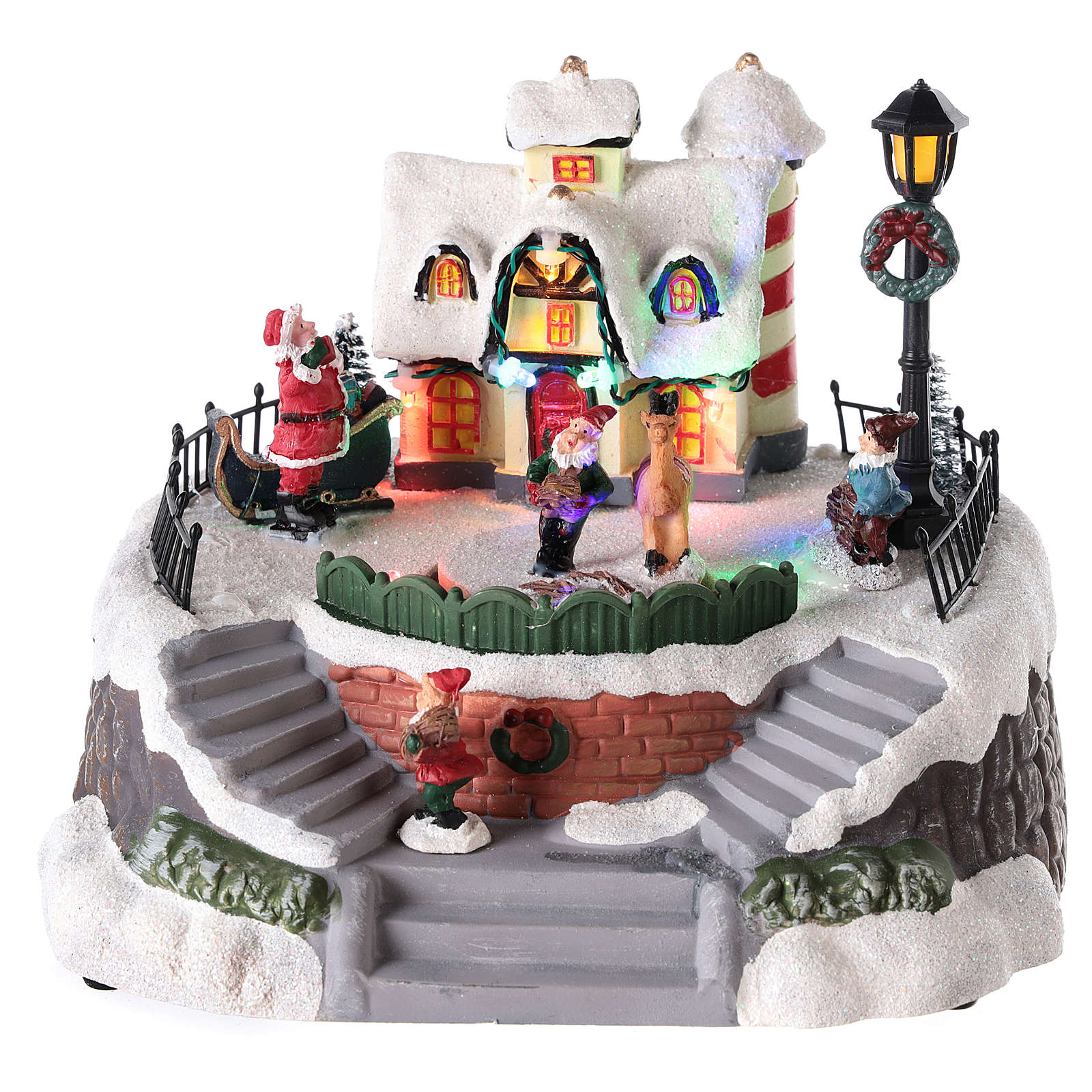 Casa de Pai Natal com elfos para cenário natalino 15x20 cm. Casa de Pai Natal en resina, alimentada por pilhas AA.Este modelo, compatível com outros cenários e acessórios do mesmo estilo (MyVillage e Lemax, por exemplo), pode ser animado por luzes, movimentos e música ao mesmo tempo ou só com movimentos e luzes.