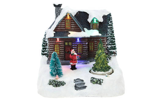 Casa iluminada com Pai Natal para cenário de Natal 20x20x15 cm. Cenário de Natal em resina alimentado por corrente eléctrica com transformador de ficha europeia 220V ou por pilhas AA.Este modelo, compatível com outros cenários e acessórios do mesmo estilo (MyVillage e Lemax, por exemplo), pode ser animado por luzes, movimentos e música ao mesmo tempo ou só com movimentos e luzes.